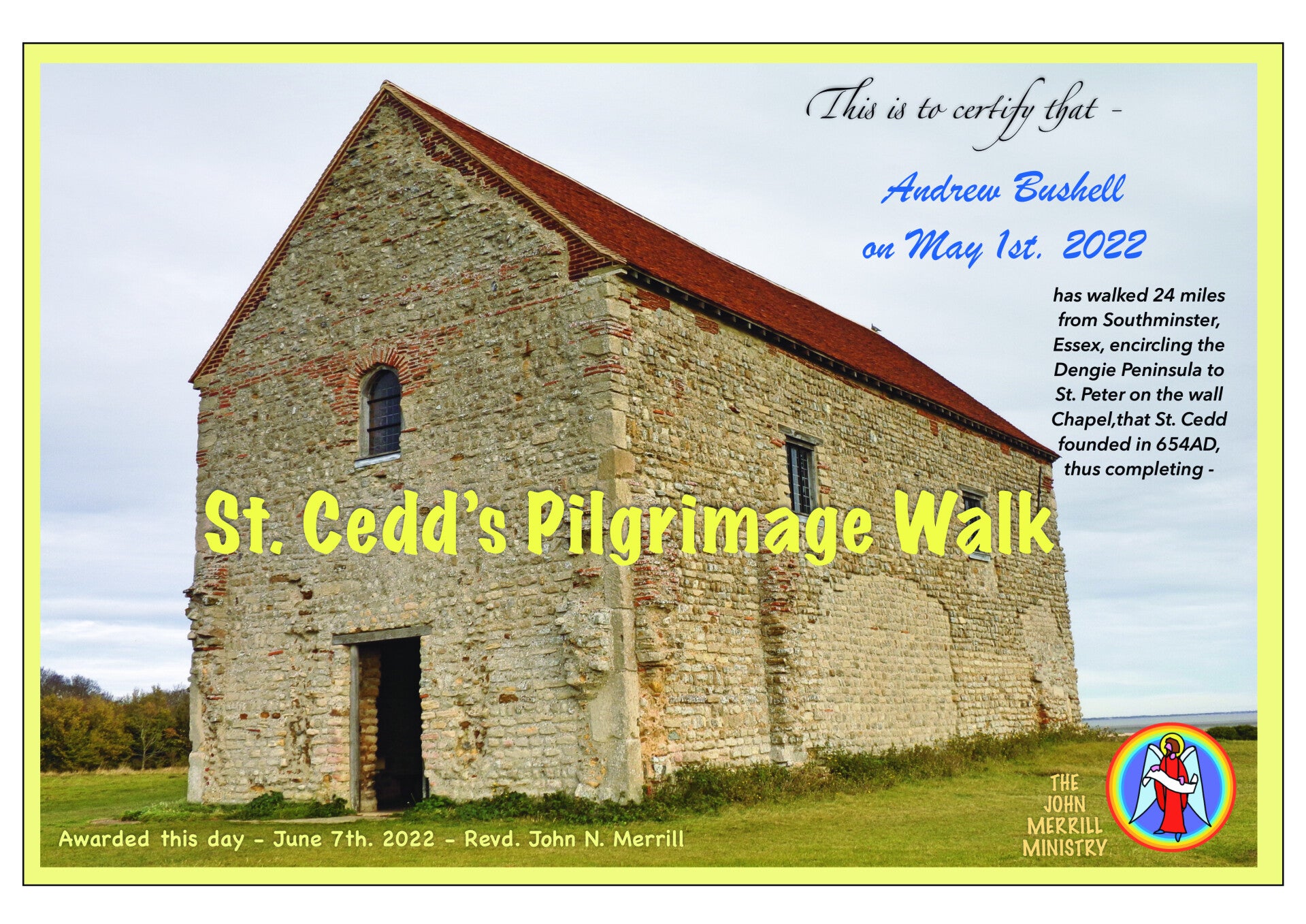 I first came to St. Peter’s on the Wall (St. Cedd’s) chapel in 1978, after walking 6,700 miles around the coast of Britain. I stayed nearby and as I approached my overnight’s halt, watched a beautiful sunset. I never forgot this remote corner of England. As my Ordination as an Interfaith Minister drew near, I said I would spend my last night in solitude on top of a mountain. But as the ceremony was due to take place in London, there are no mountains closeby. instead, I immediately thought of the chapel, which being one of the earliest .